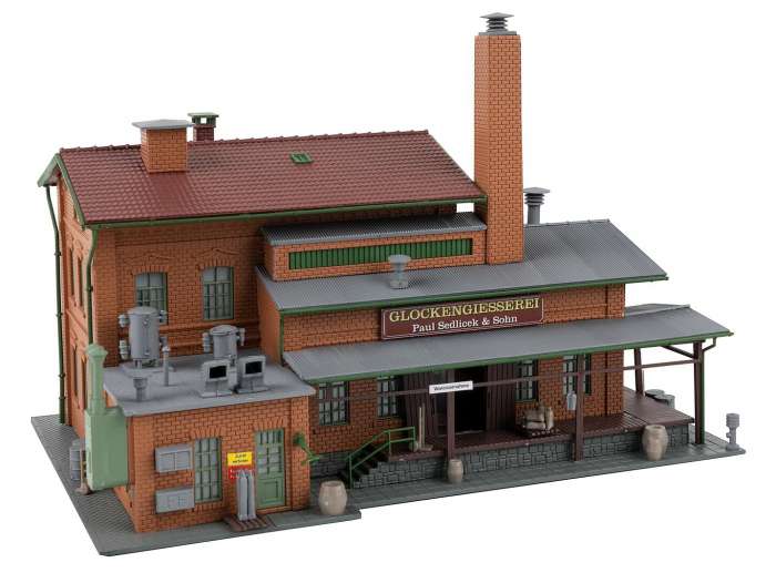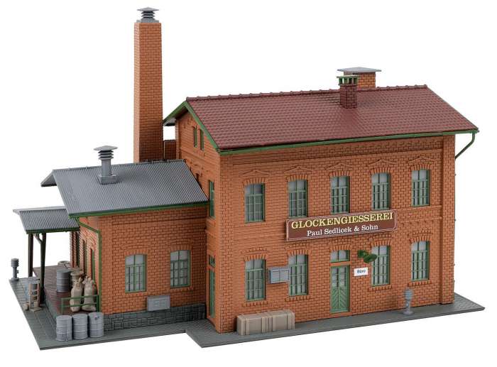 Industriële fabriek in klinkerconstructie! Dit gedetailleerde model toont een traditionele klokkengieterij waarin klokken in een grote verscheidenheid aan maten worden gegoten. Het twee verdiepingen tellende hoofdgebouw met een zadelplafond is gemaakt van rood klinkerbaksteen en heeft fijn gereproduceerde boogramen. Aan de zijkant van het gebouw bevindt zich een uitbreiding met een gegolfd dak en een zijhelling, wat zorgt voor realistische laadscènes. Een hoge schoorsteen, evenals talrijke bijkomende details zoals vaten, zakken, lampen en borden, maken de authentieke industriële sfeer compleet.